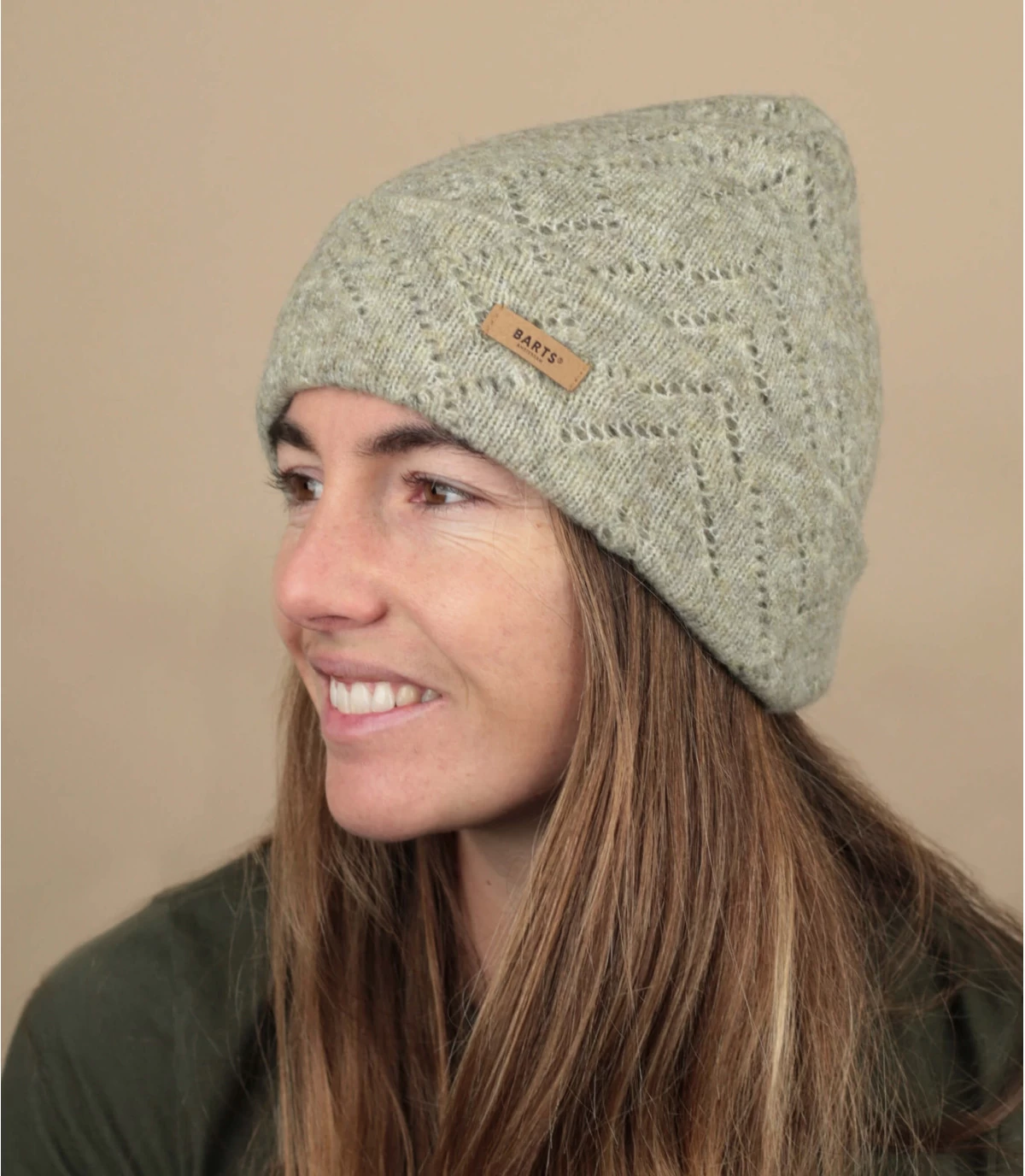 Ce bonnet à revers vert pour femme est d’un coloris pastel léger et arbore un motif de mailles aéré et élégant. Il est aussi éco-responsable puisque sa fabrication inclut des matières recyclées.