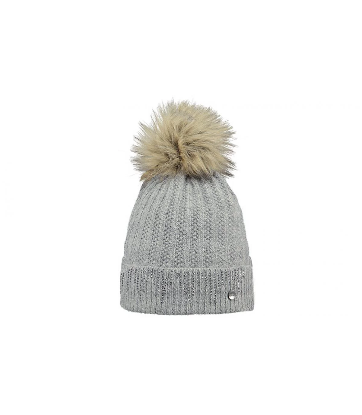 Ce bonnet gris à pompon en fausse fourrure est doublé à l’intérieur. Des strass décorent le revers. Bonnet 100% synthétique. Un bonnet féminin qui mettra en valeur votre personnalité soignée.