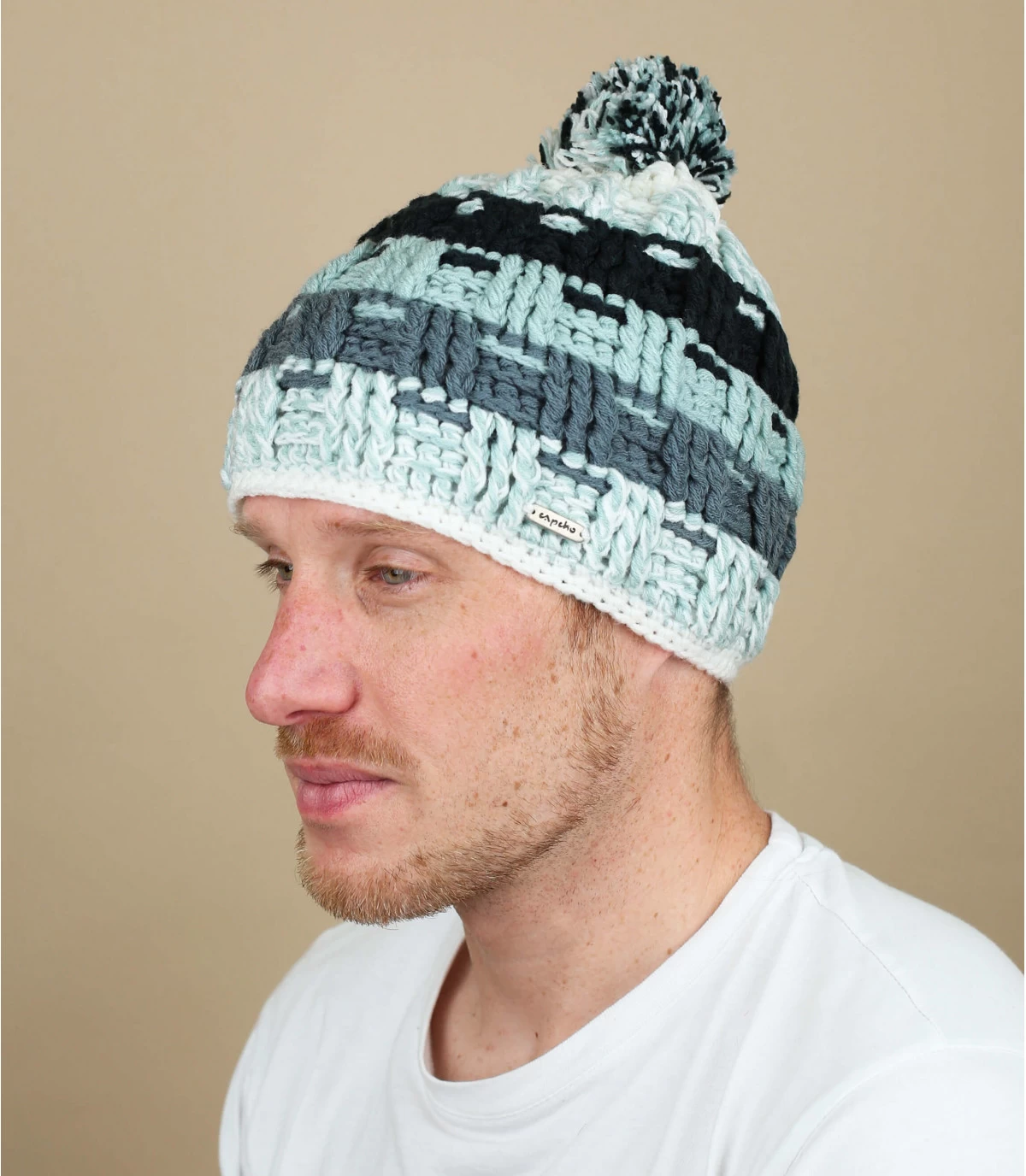 Bonnet pompon gris et bleu marine pour homme de la marque Capcho. Bonnet doublé polaire, tricoté à la main au Népal.