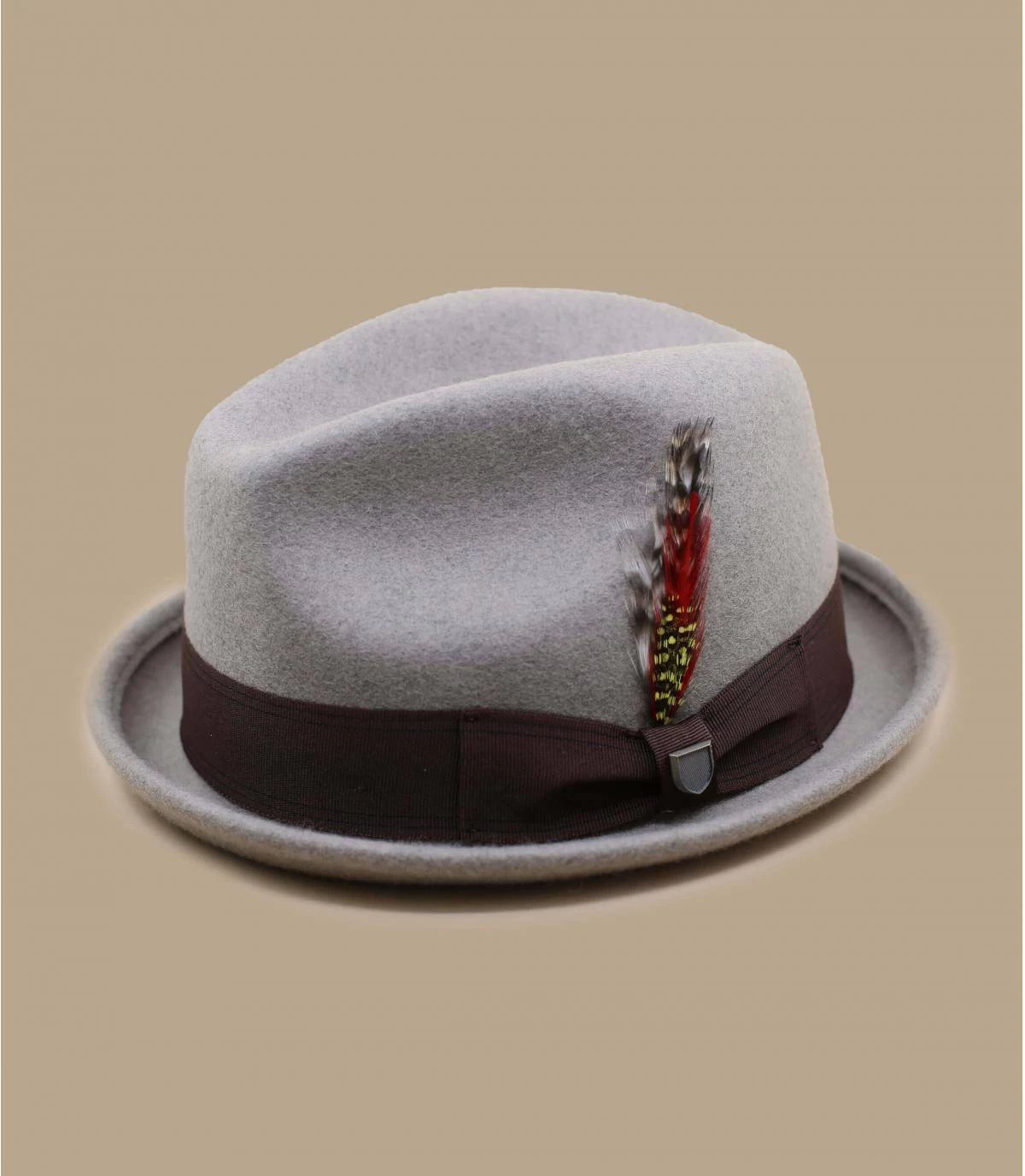 Le feutre de laine qui compose ce superbe pork pie affiche une nuance beige naturelle, relevée d’un très large galon brun noué où ressortent un petit écusson de métal et un joli plumet multicolore.