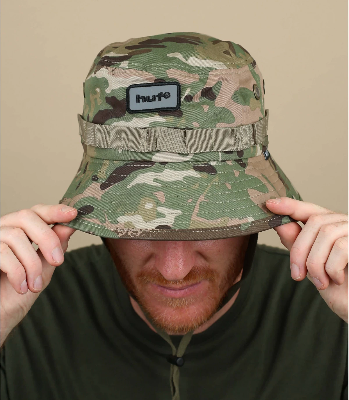 Pour vos expéditions en ville ou à la campagne, portez ce chapeau boonie branché décoré d’un motif camouflage de style army. Alliant tendance et confort, il est aéré et ajustable par une lanière élastique. Son patch rectangulaire à l’avant montre Huf.