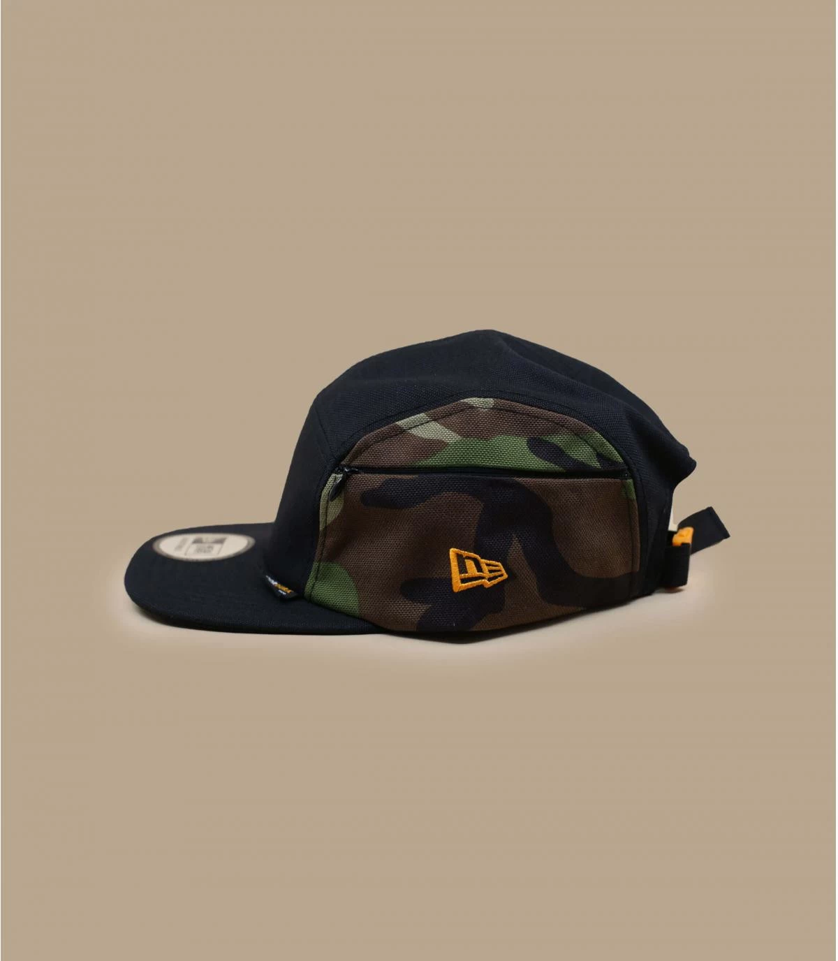 Adoptez une allure pointue, avec cette casquette 5 panel d’un noir discret, relevée d’empiècements à imprimé camo sur les côtés. Idéale pour donner un côté edgy à une tenue décontractée, elle nous est proposée par la marque spécialisée New Era.
