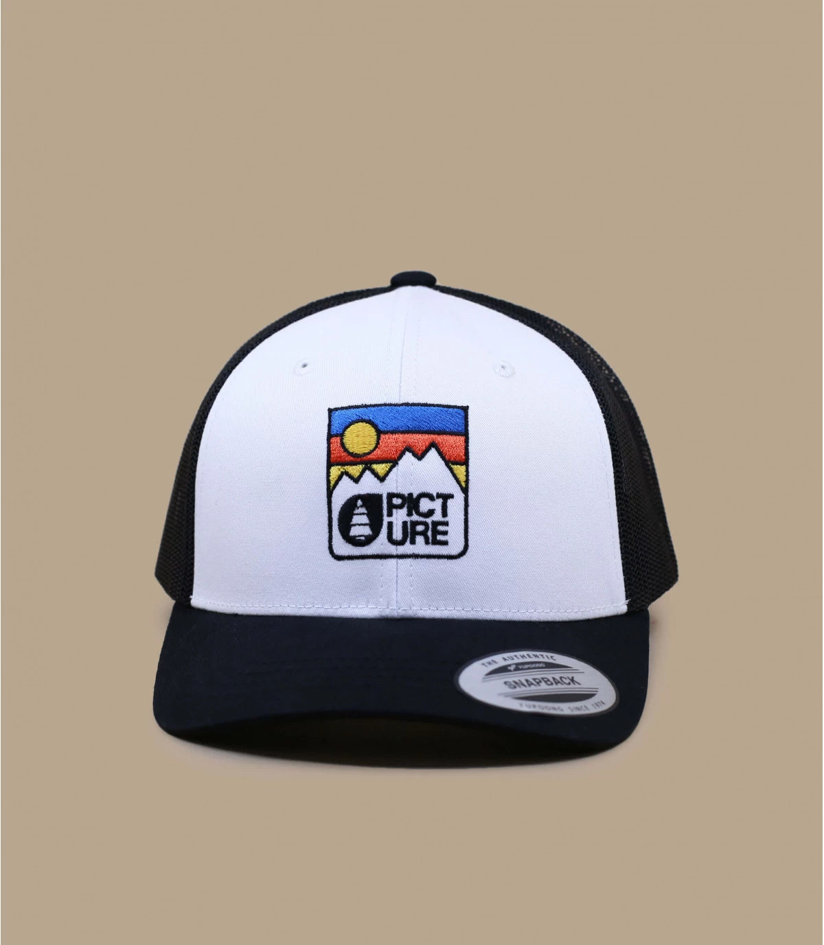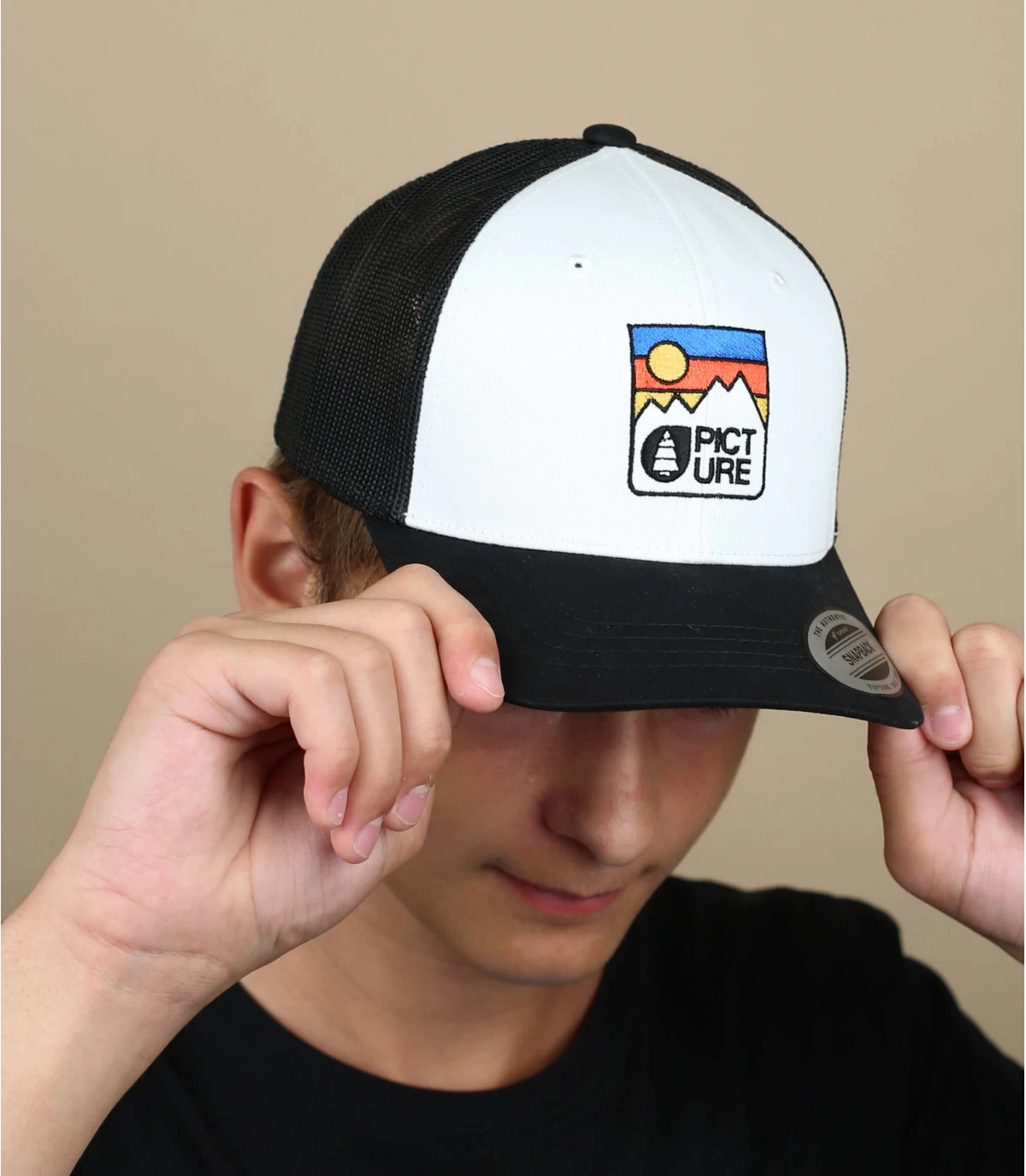 N’oubliez pas d’emmener cette trucker pour enfant dans votre prochaine aventure ! La broderie colorée pourrait représenter la photo d’une montagne à l’aube, on y voit Picture à côté d’un sapin. Le filet à l’arrière est noir en matière recyclée.