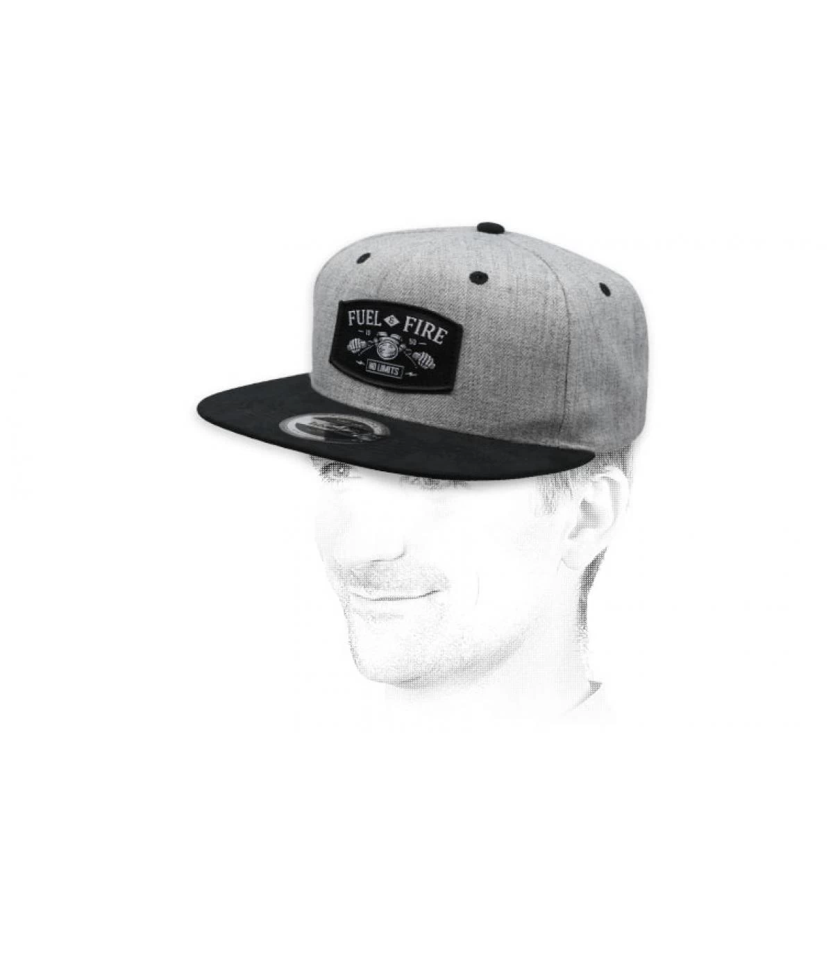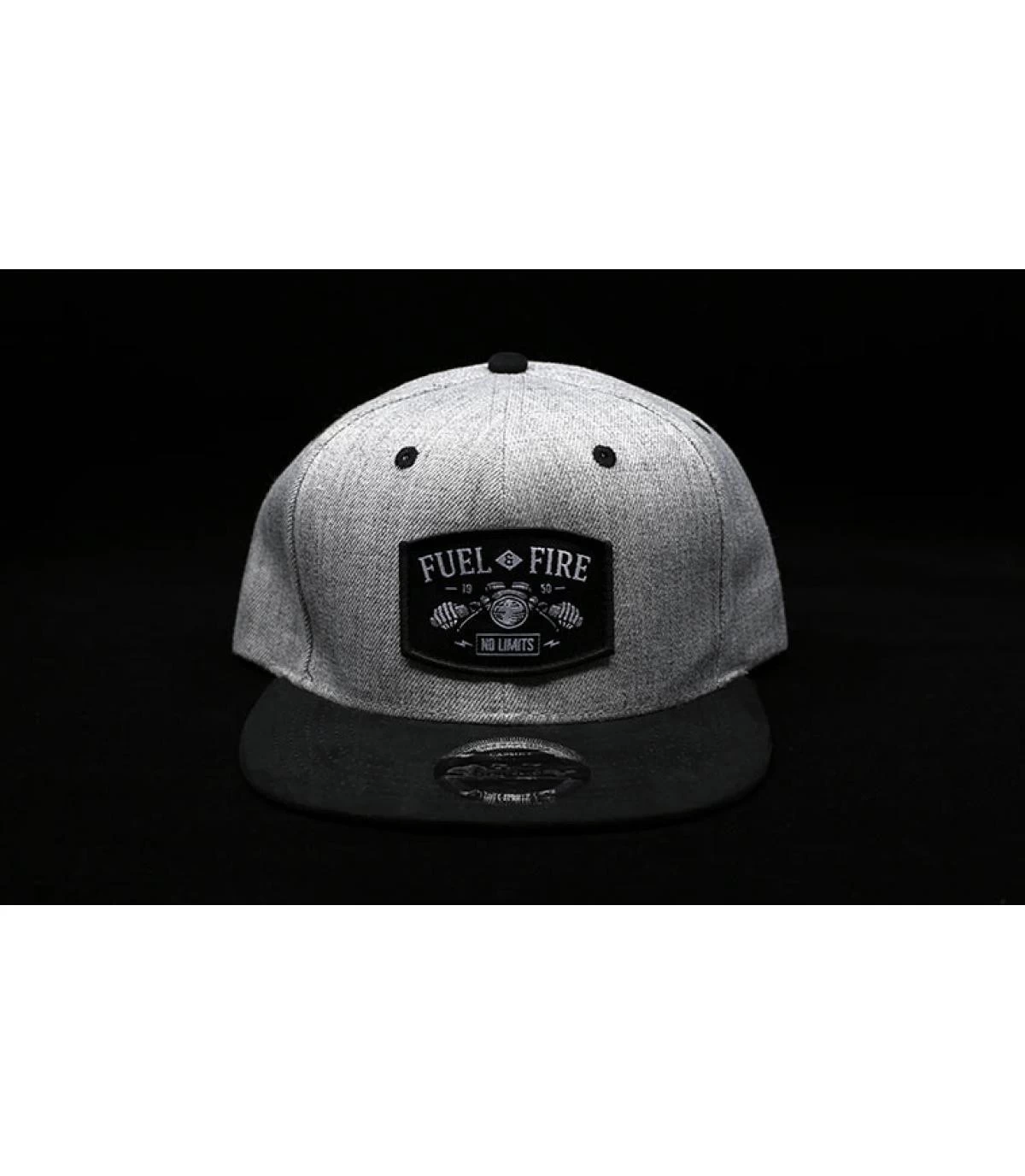 Sur le fond gris lumineux de cette belle casquette snapback à visière noire s’affiche un patch en tissu exclusif « FUEL AND FIRE 1950 NO LIMITS », montrant une moto conduite par un squelette. Elle fait partie de la collection Headict Infernoil, qui remémore la contre-culture britannique des années 50 et ses motos allégées pour être le plus rapides possible.