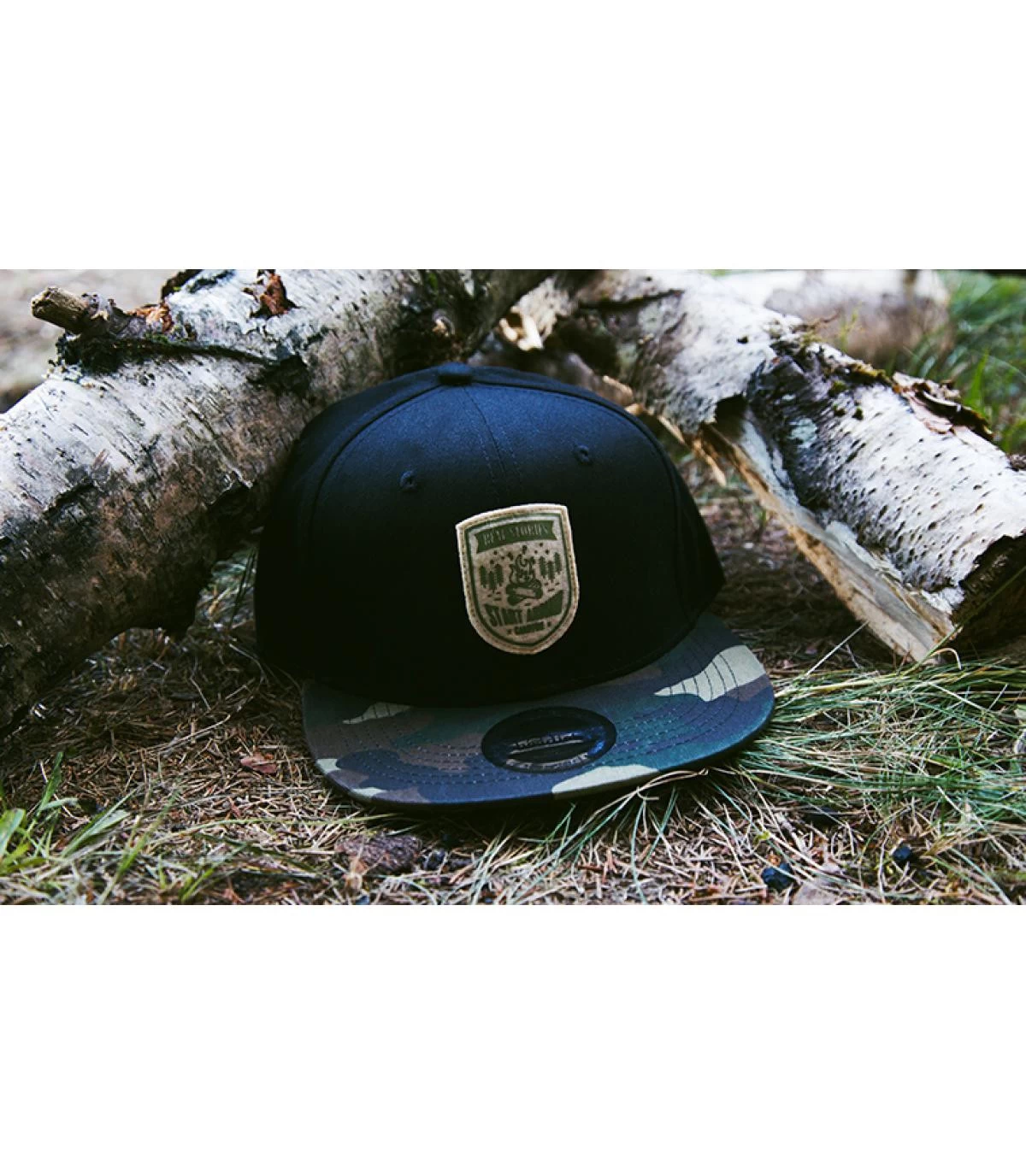 Les meilleures histoires se racontent autour d’un feu de camp, à moins que tout ne commence à ce moment-là … Cette superbe snapback noire à visière camo nous régale avec son patch exclusif pour Headict. Il est en feutrine beige imprimée kaki et son joli design rétro nous donne envie de passer plus de temps dehors.