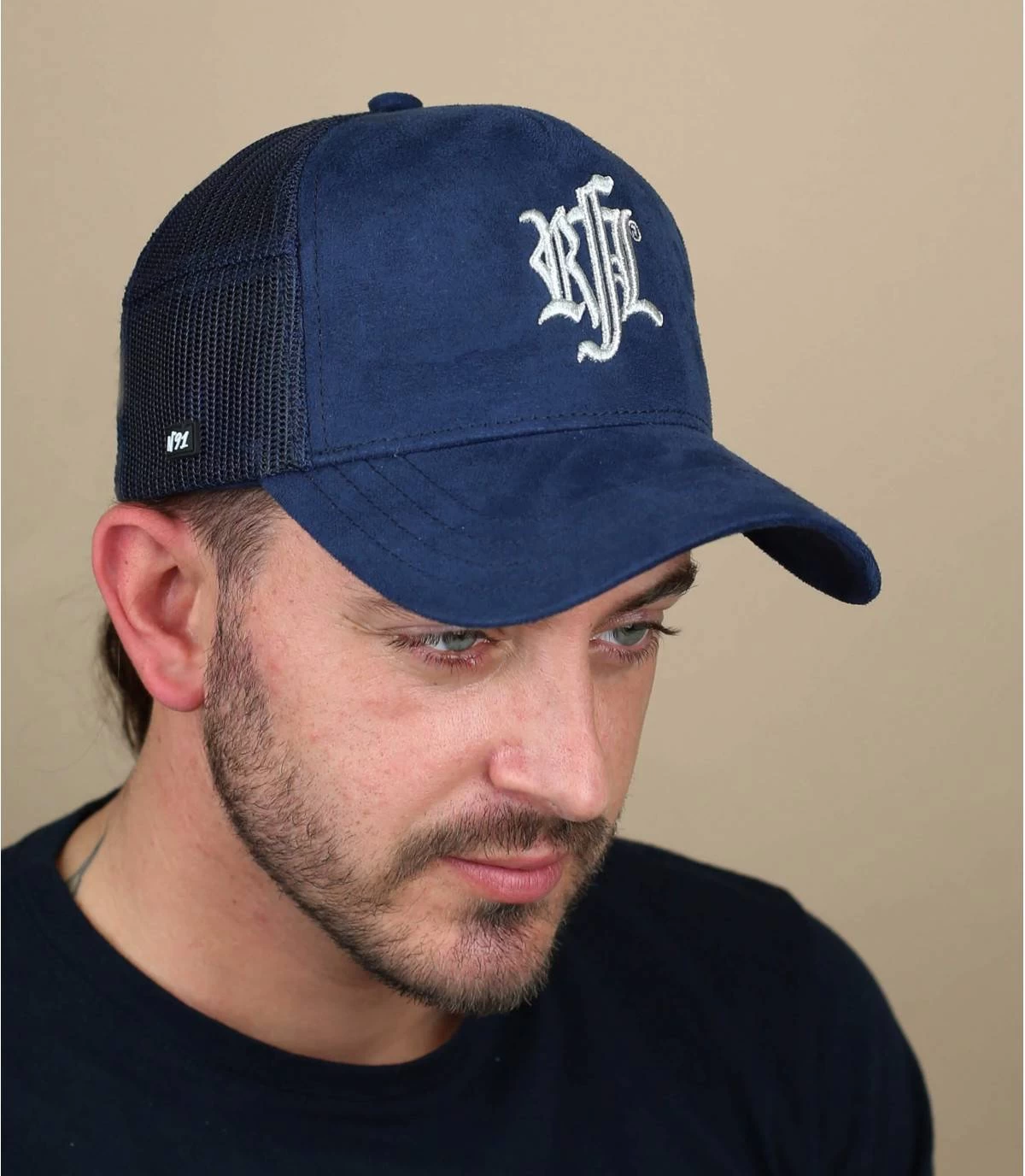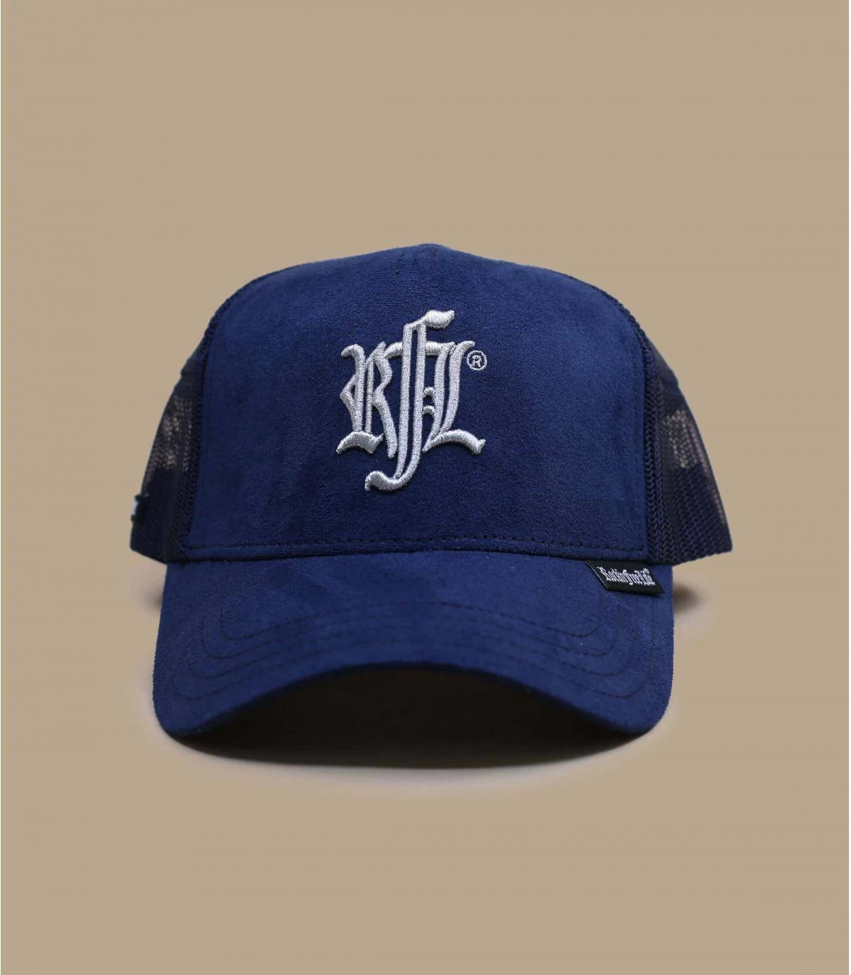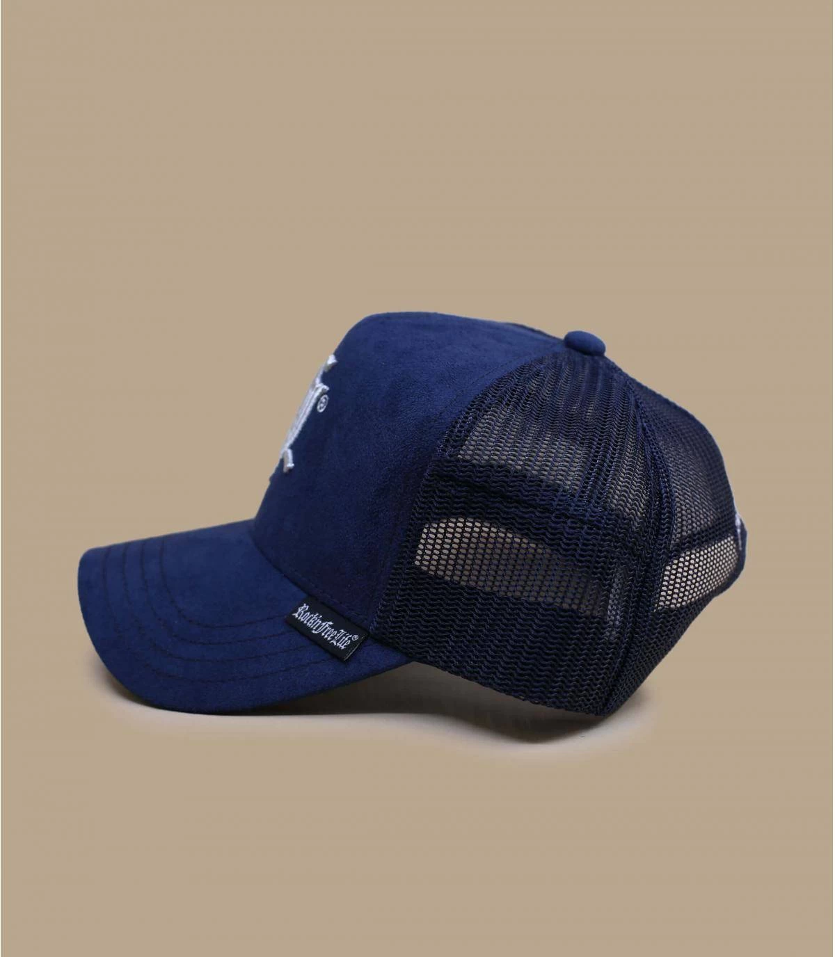 Portez cette casquette trucker avec un plateau en suédine bleue marine pour un style à la fois doux et fashion. Le logo de la marque est brodé de blanc sur le filet arrière.