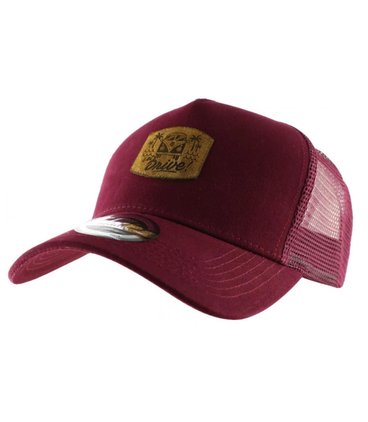 Une trucker bordeaux ultra tendance, décorée d’un patch en cuir gravé d’un dessin sympathique mettant en scène le combi préféré des surfeurs. Un modèle exclusif de la collaboration Van Life.