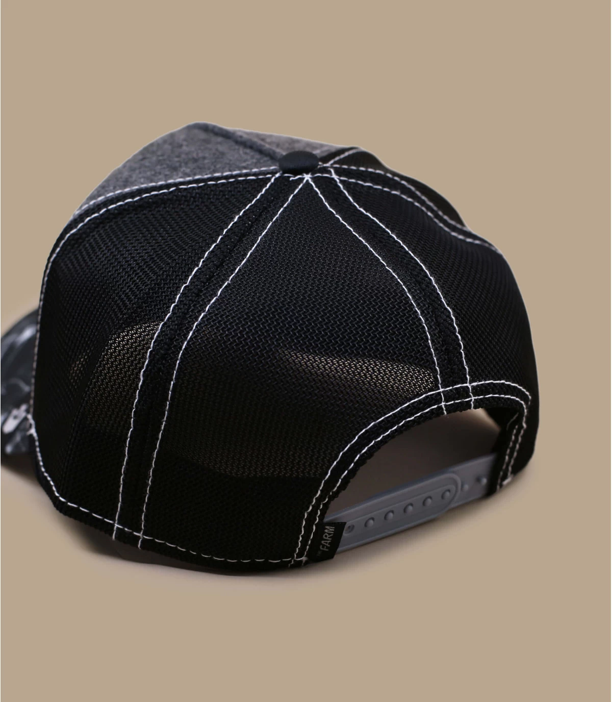 Entrez dans le poulailler avec cette casquette trucker noire originale ! Elle porte un imprimé de fumée gris et noir. Sur le patch avant, on peut voir un coq maltais, une espère rare dont le plumage noir sert de camouflage.
